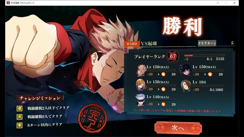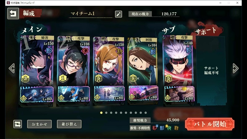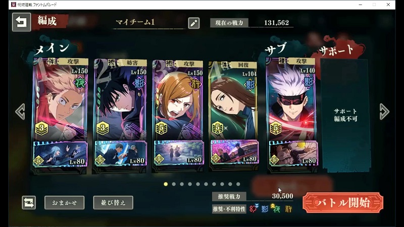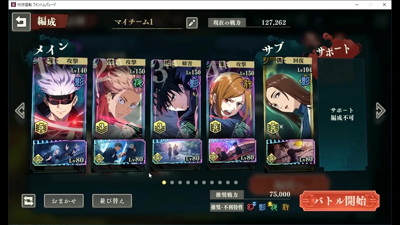 LV150の虎杖悠仁・伏黒恵・釘崎野薔薇のメインキャラ、回復係は家入硝子、五条悟は急用のスキルで離脱してしまうのでサブで待機させます(*’ω’*)